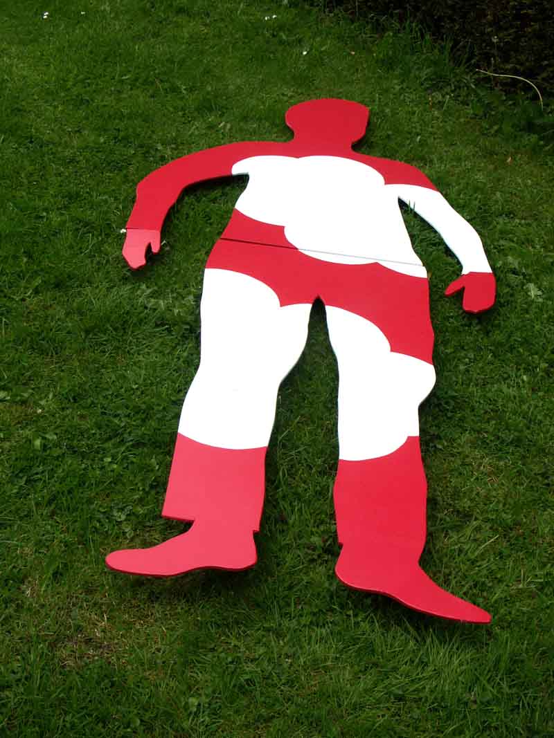 Twee sculpturen van hout die een onderdeel vormen van een wolkeninstallatie.