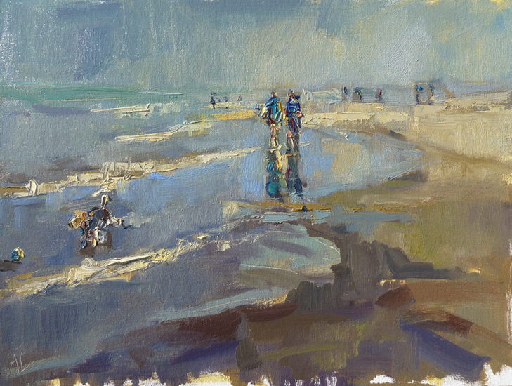 Plein air geschilder op het strand. Titel: 'Walking the dog nr 2'.