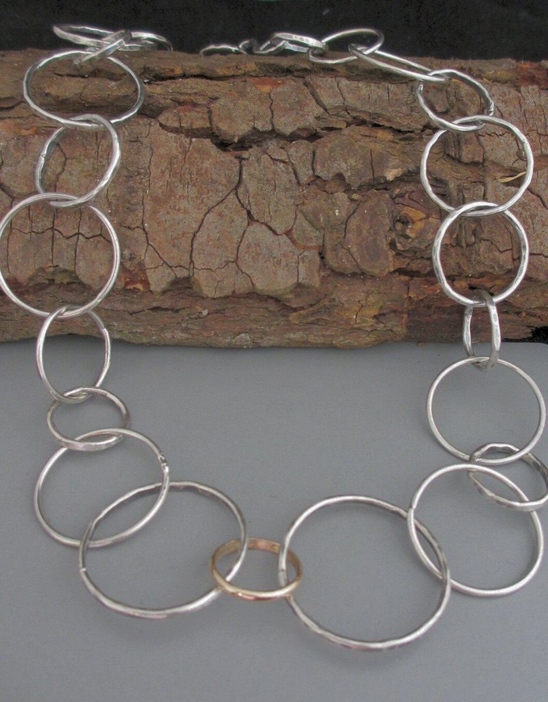 collier bestaande uit gehamerde zilveren ringen en een gouden ring