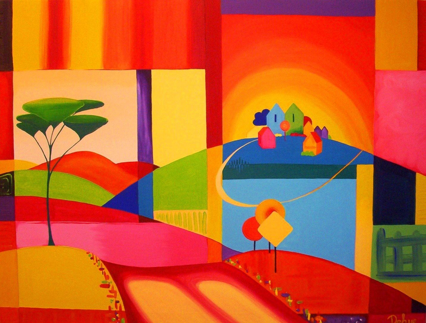 Zon Figuratief Modern Rood Oranje Geel Landschap Blauw Paars Groen Kleuren Kleurrijk Natuur Bergen Bomen Abstraherend Roze Vrolijk Landscape Fantasie Kleur Lila Huisjes Colorful Pad