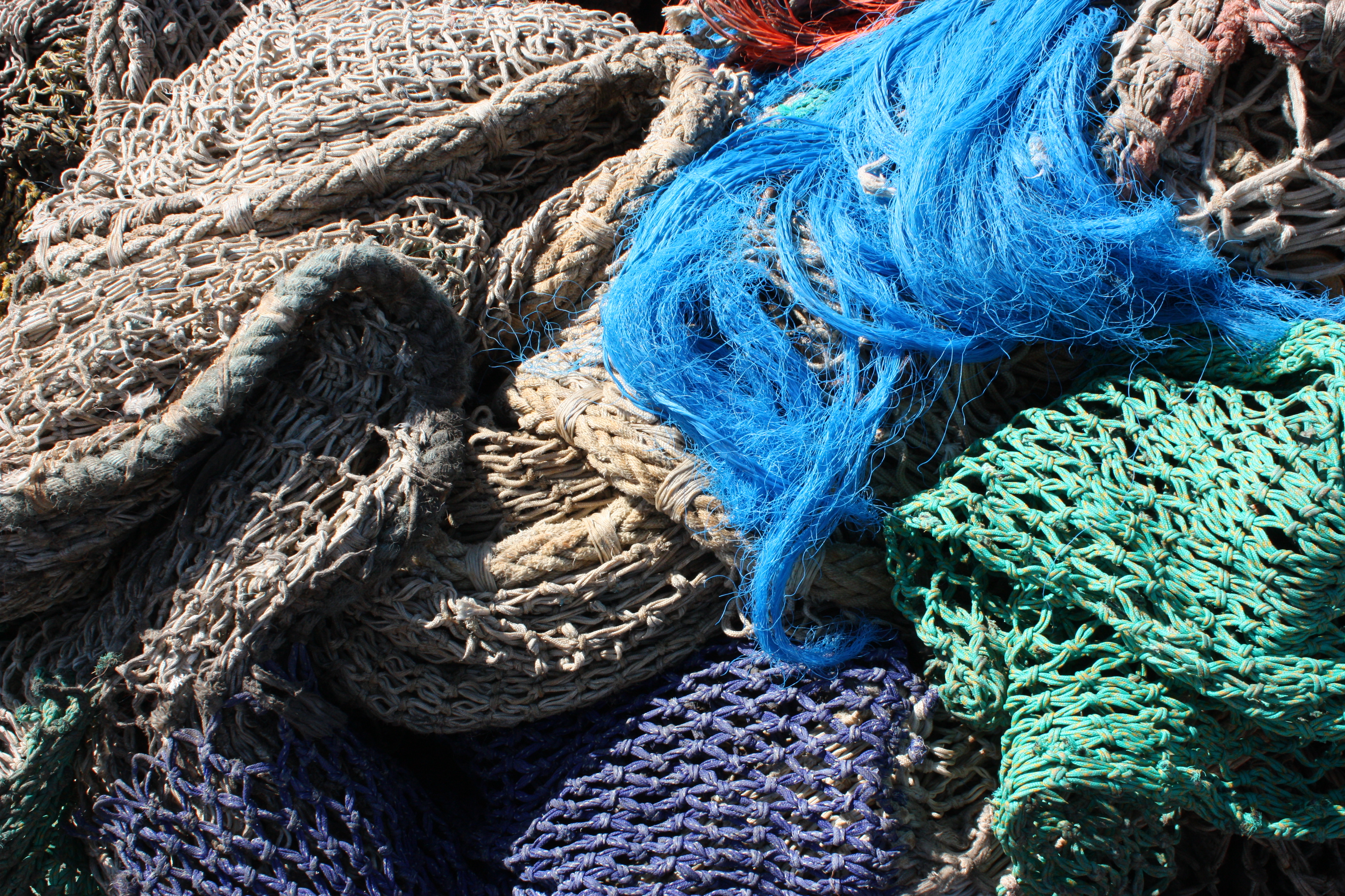 Gekleurde netten en touwen in vissershaven