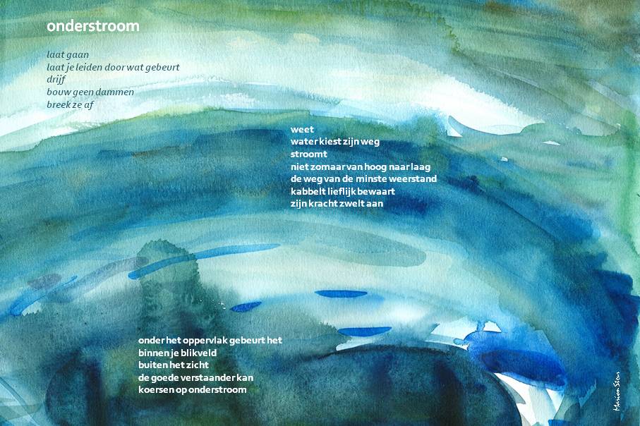 onderstroom laat gaan laat je leiden door wat gebeurt drijf bouw geen dammen breek ze af weet water kiest zijn weg stroomt niet zomaar van hoog naar laag de weg van de minste weerstand kabbelt lieflijk bewaart zijn kracht zwelt aan onder het oppervlak gebeurt het binnen je blikveld buiten het zicht de goede verstaander kan koersen op onderstroom Gedicht tegen een achtergrond van aquarel. De aquarel is ingescand en daarna is het gedicht over de afbeelding verdeeld. Print van 35 x 55 cm op canvas. Andere formaten in overleg. Oplage 5 stuks.