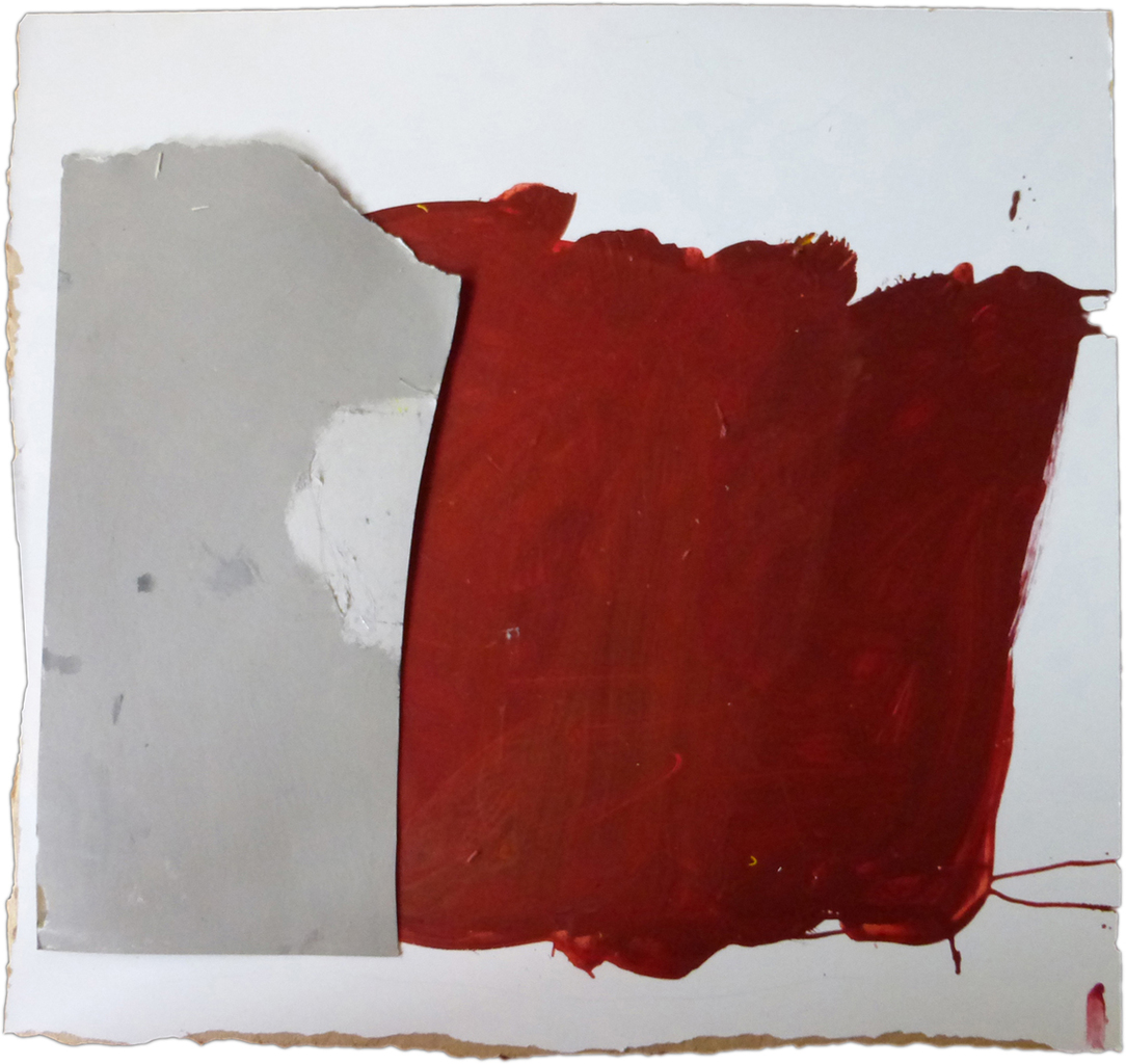 Een collage met menierood vlak: acrylverf en karton op hardboard.