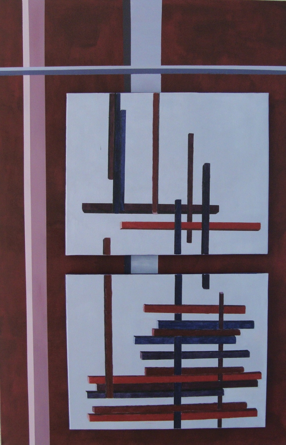 Geometrisch schilderij in paars-blauw tinten. Kan zowel horizontaal als verticaal worden geplaatst. Op het onderste doek zijn twee kleinere doeken geplaatst.