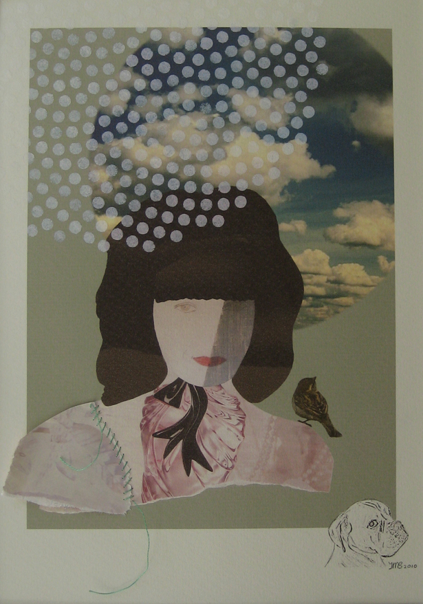 Zelfpotret op aquarelpapier. gebruikte materialen: Aquarelpapier, tijdschriften, borduurgaren techniek: collage en photoshop