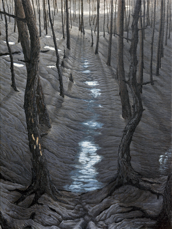Het eerste schilderij uit een serie over het verbrande dennenbos in het Schoorlse duin, zie ook de fotoserie Houd moed/Hout moet.