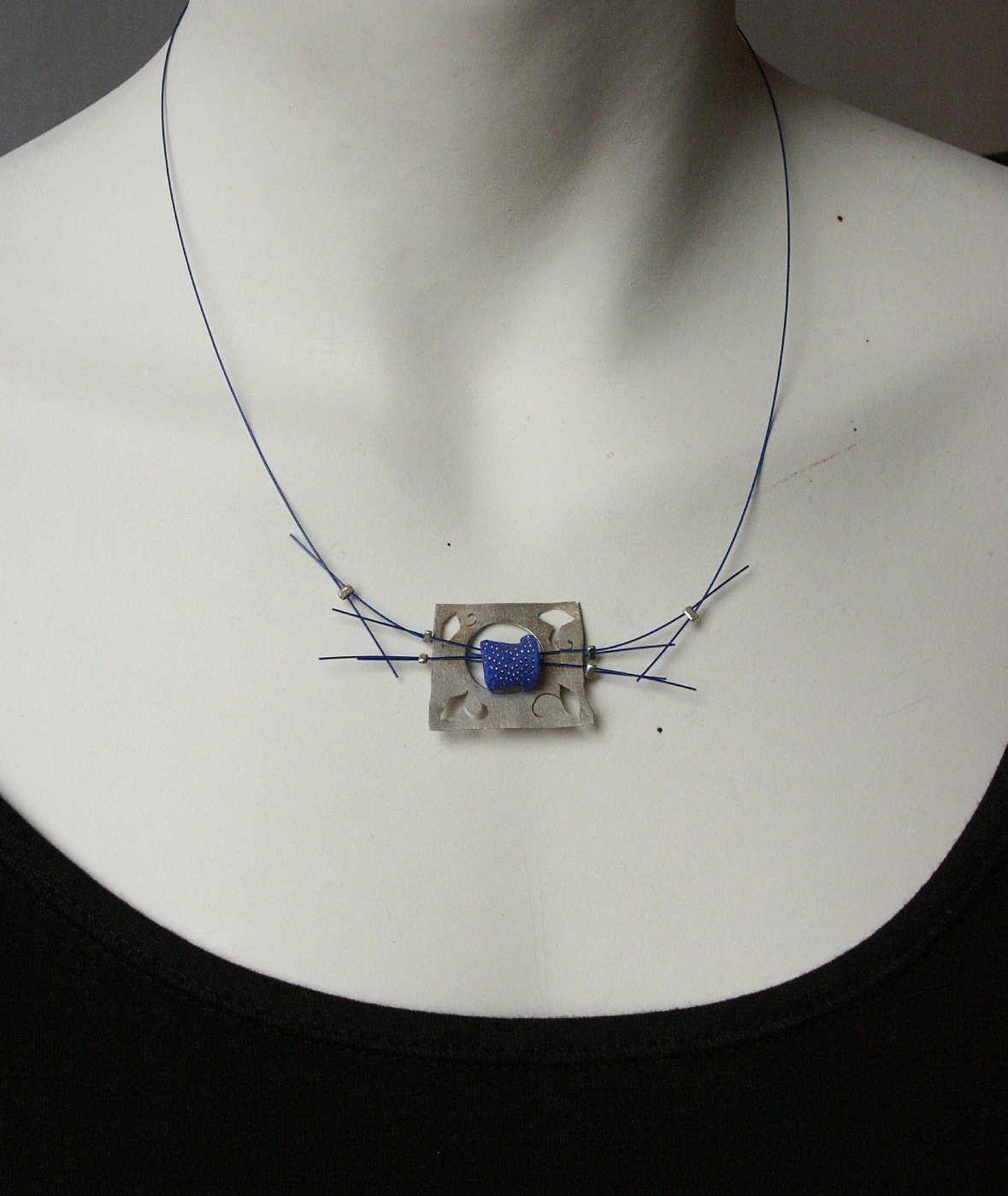 Ingezaagd motief in zlver met blauwe kraal en gecoat staaldraad. Prijs: € 45,-