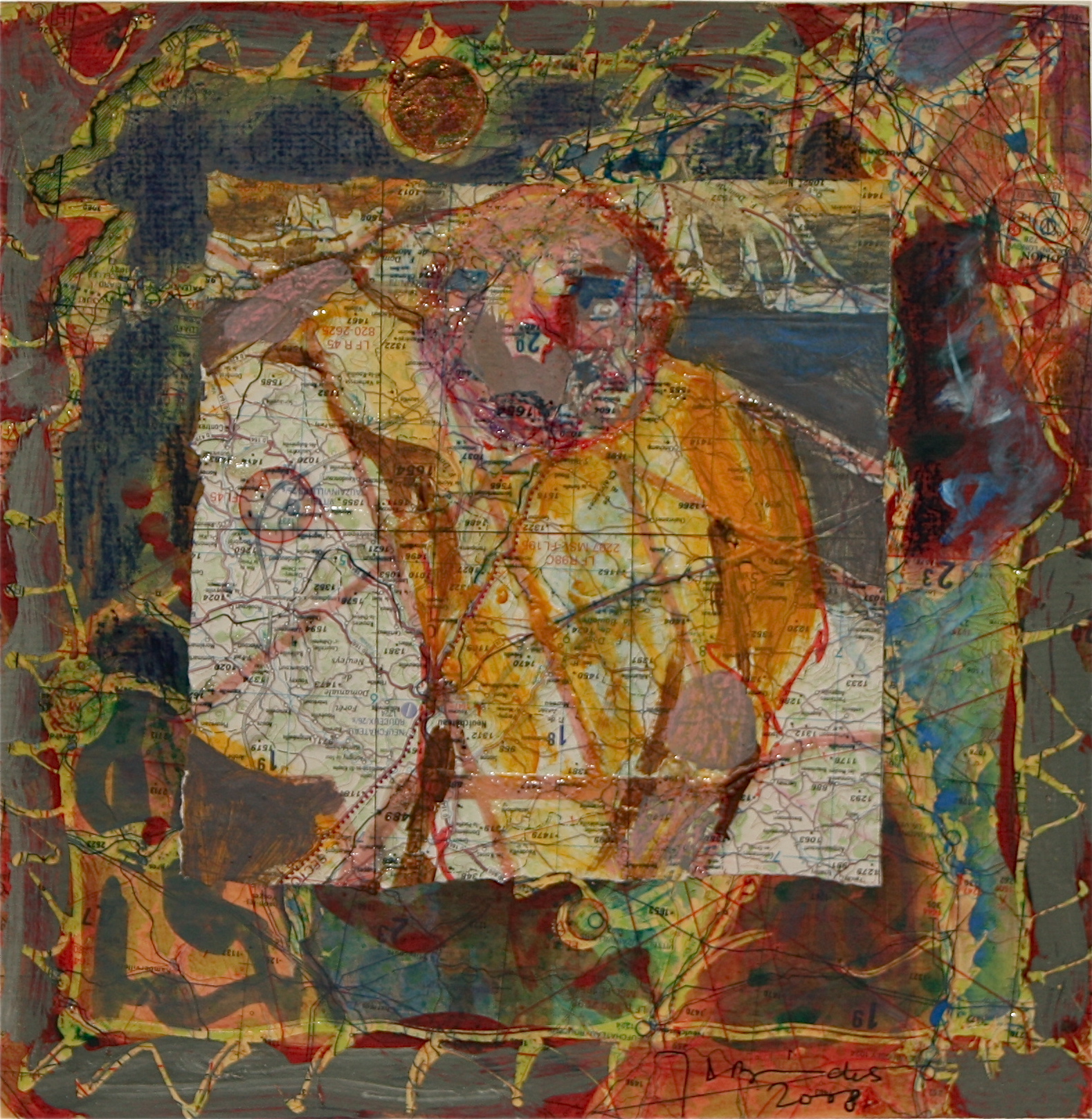 Collage van gemengde techniek (lijm / acryl) op luchtnavigatiekaart + bladmetaal