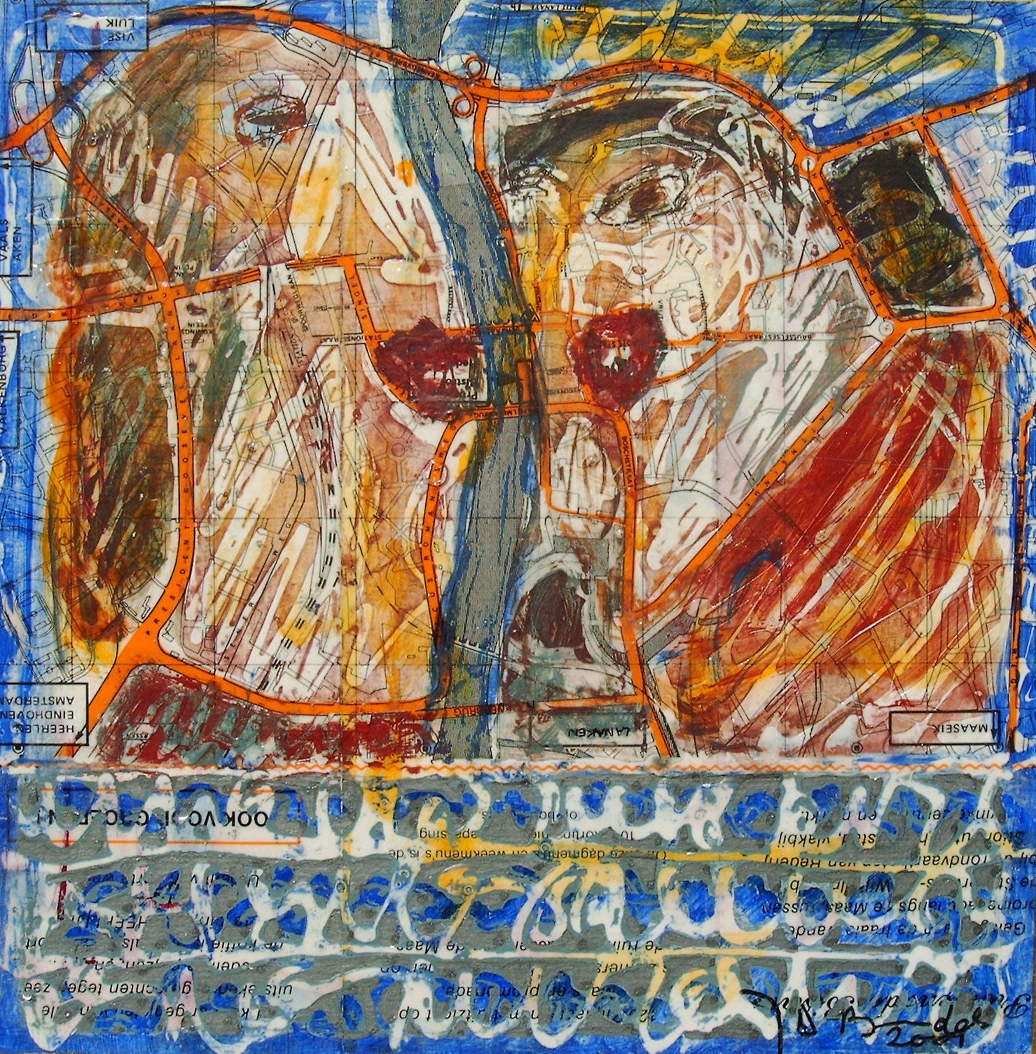 Gemengde techniek (lijm / acryl) op stadsplan van Maastricht