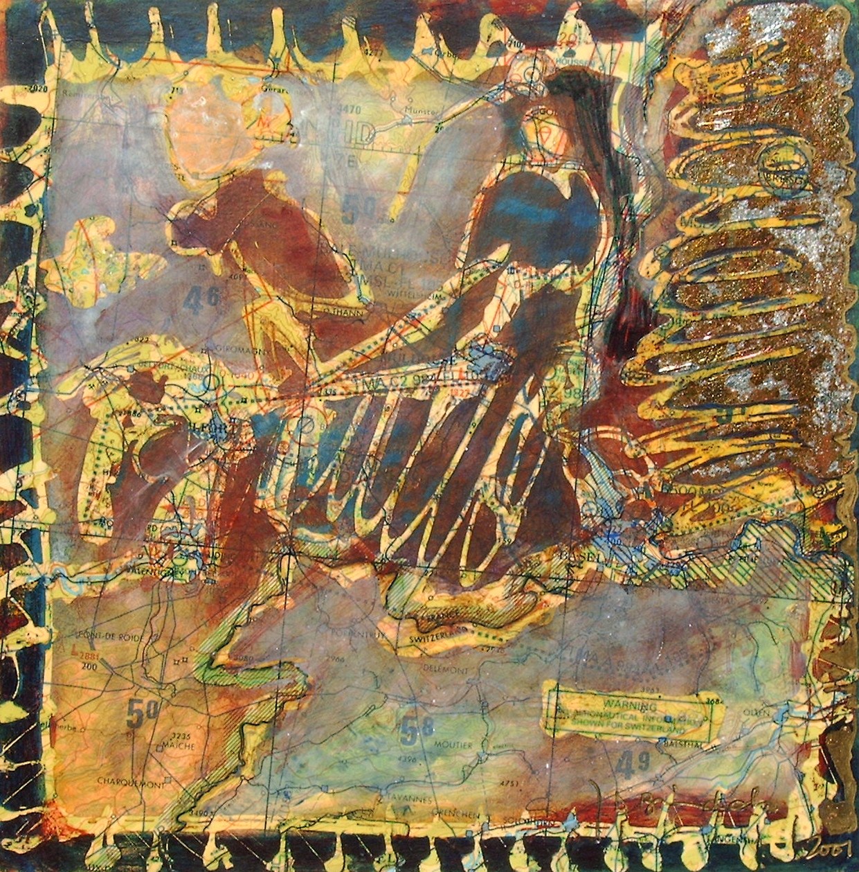 Gemengde techniek (lijm / acryl) op luchtnavigatiekaart + bladmetaal