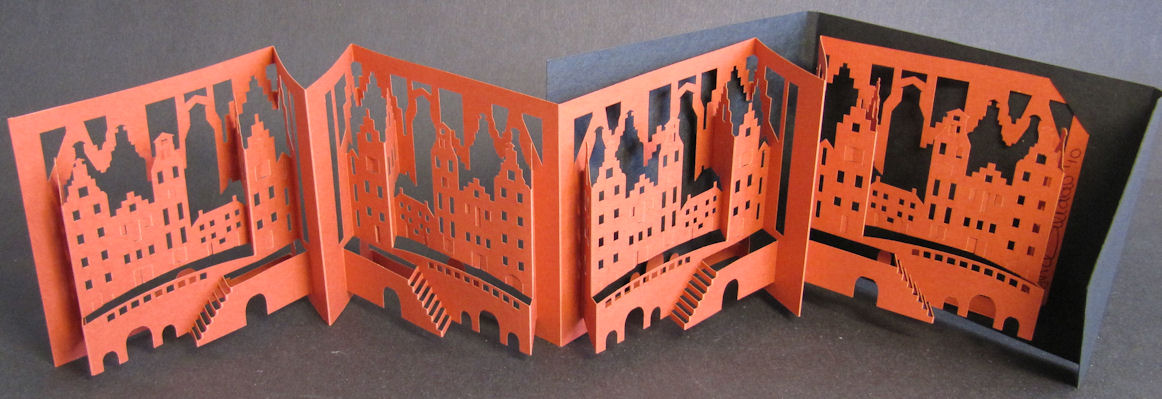 Een reeks kleine grachtenpandjes in boekje verwerkt en gemaakt in verschillende kleurstellingen.