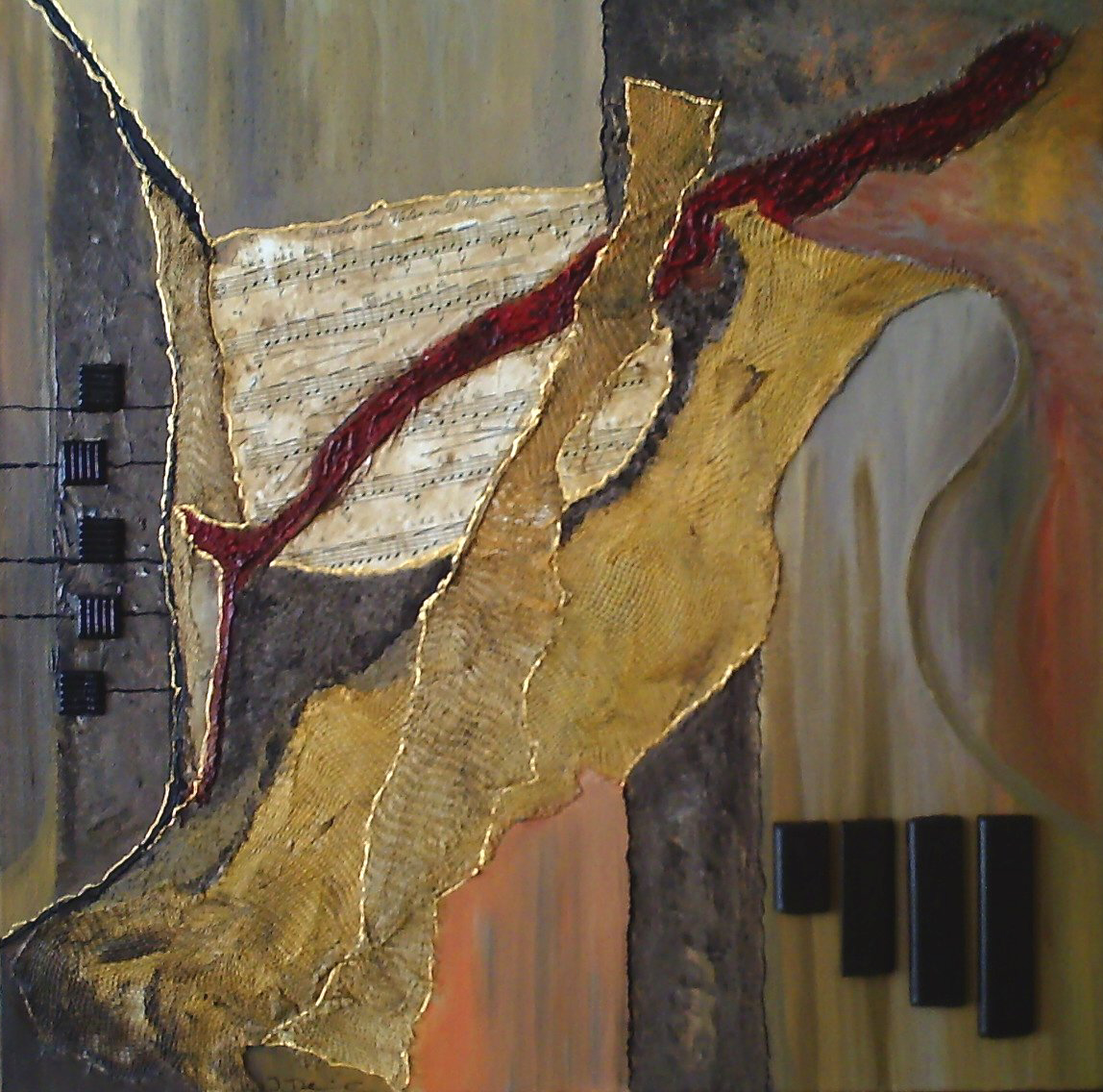 Een van de vier schilderijen met als speciaal thema: de Marimba. Op elk schilderij is bladmuziek verwerkt: Furioso and Valse by Earl Hatch. Inspiratiebron: Roy Derix (marimba). Site: www.royderix.com Niet te koop.
