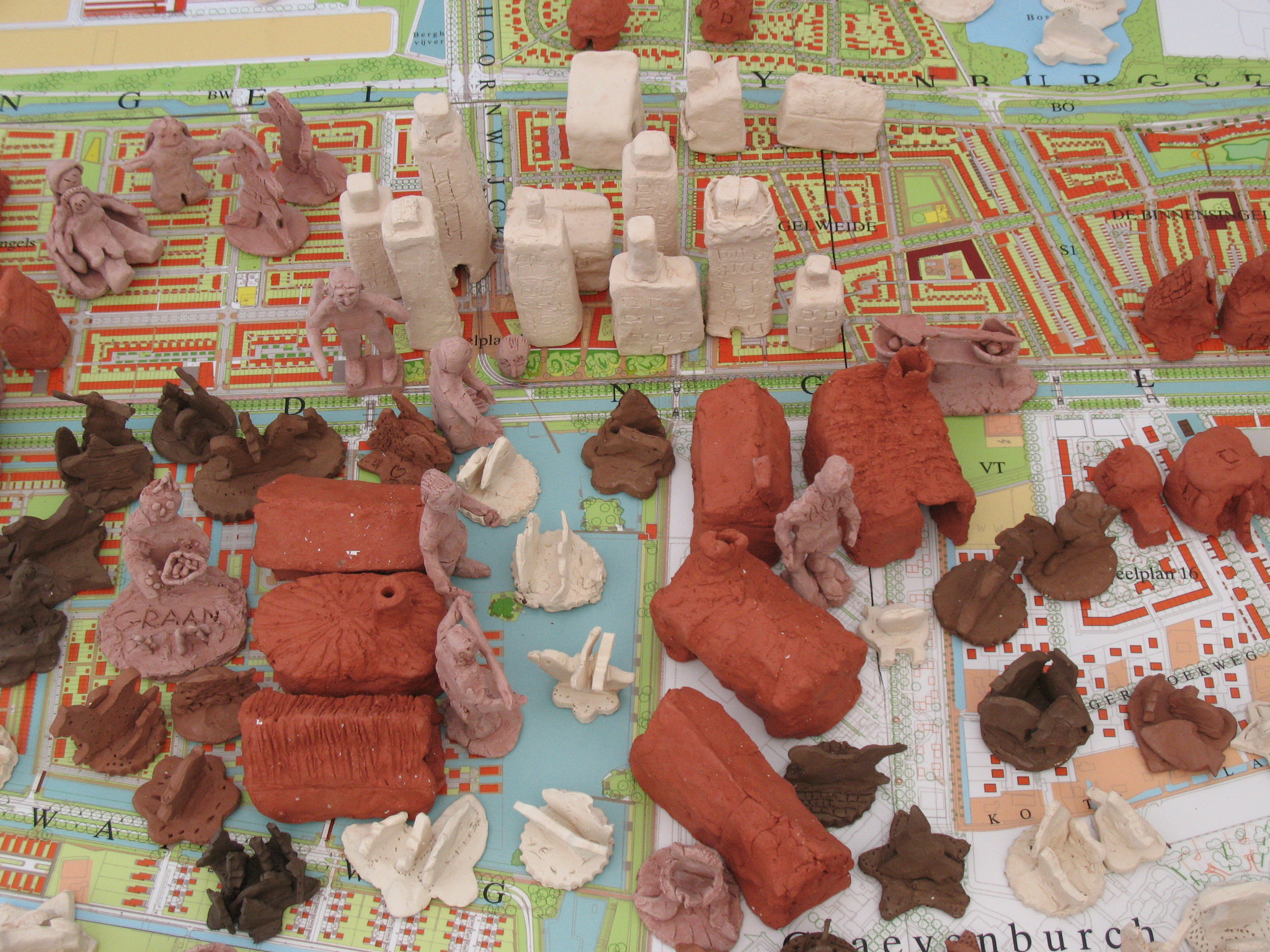 In gezamenlijk project Jonge Kunstlijn met kinderen van school, opvang en scouting het werk "Ypenburg op de kaart" gemaakt. Hierbij hebben kinderen samen met mij beeldjes gemaakt die heden en verleden van de wijk Ypenburg in Den Haag uitbeelden en wat daarna gepresenteerd werd op de Oude Kustlijn in Ypenburg.