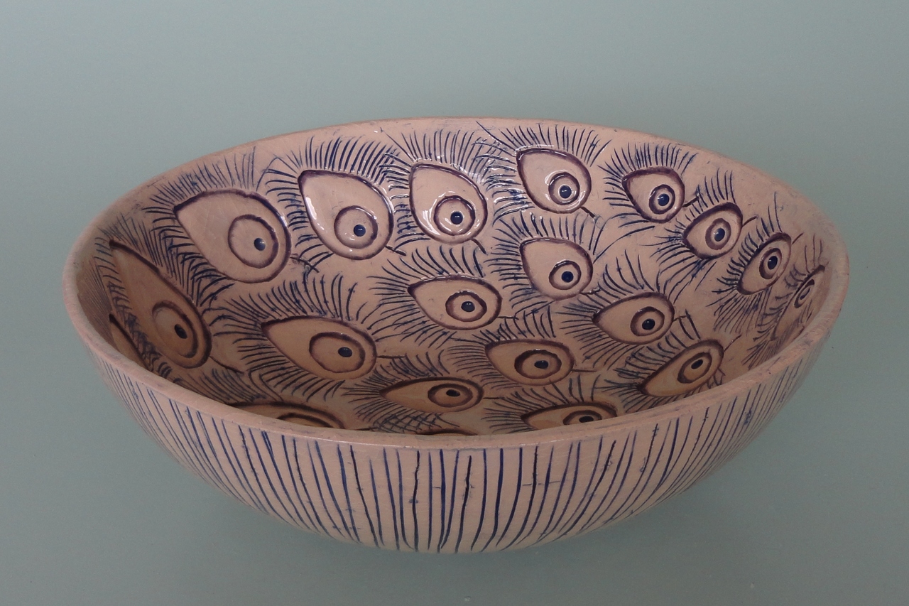 ronde schaal met pauwmotieven in relief