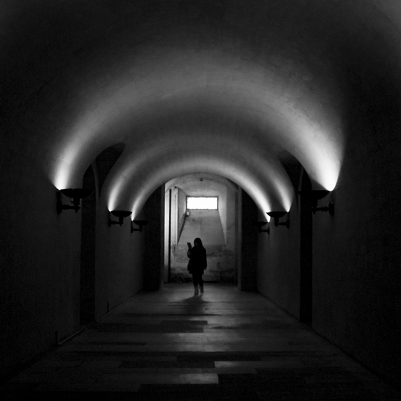 In de kelder van het Panthéon. Lege, verlichte gangen Een enkele voorbijganger Zoektocht