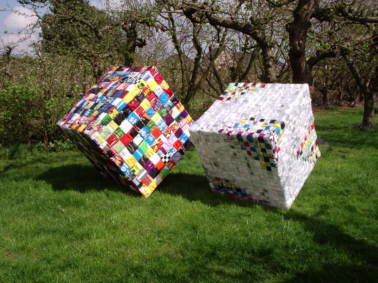 Drie kubussen: (Vierkante) ergernis over allerlei plastic verpakkingen/tasjes die toch in gebruik weer handig zijn.(Gemak)
