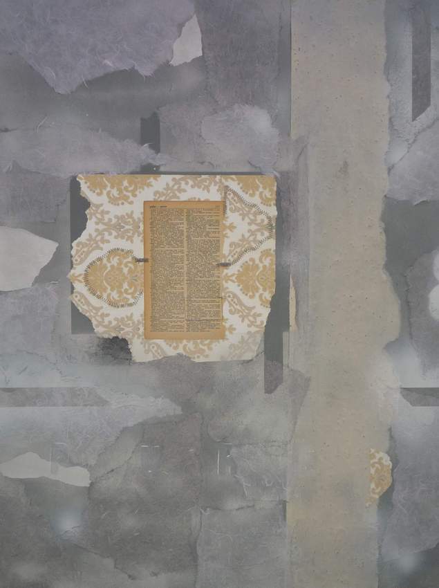Mixed media op doek, met oud behang en woordenboekpagina met het woord Pure. Vormt een tweeluik met het schilderij &Simple. Samen Pure&Simple.