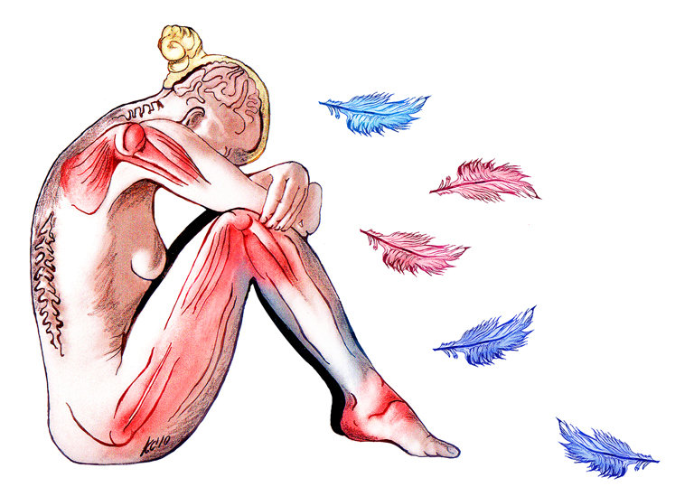 Ilustratie bij verhaal: " Altijd Pijn ". Opstaan met pijn, nauwelijks iets doen en ’s nachts weer wakker liggen van de pijn. Het bestaat. Illustratie Karin Creemers, Auteur Hélène van Beek Hulp van een E-coach van het Rabdoudziekenhuis biedt verlichting bij patienten met Fibromyalgie.