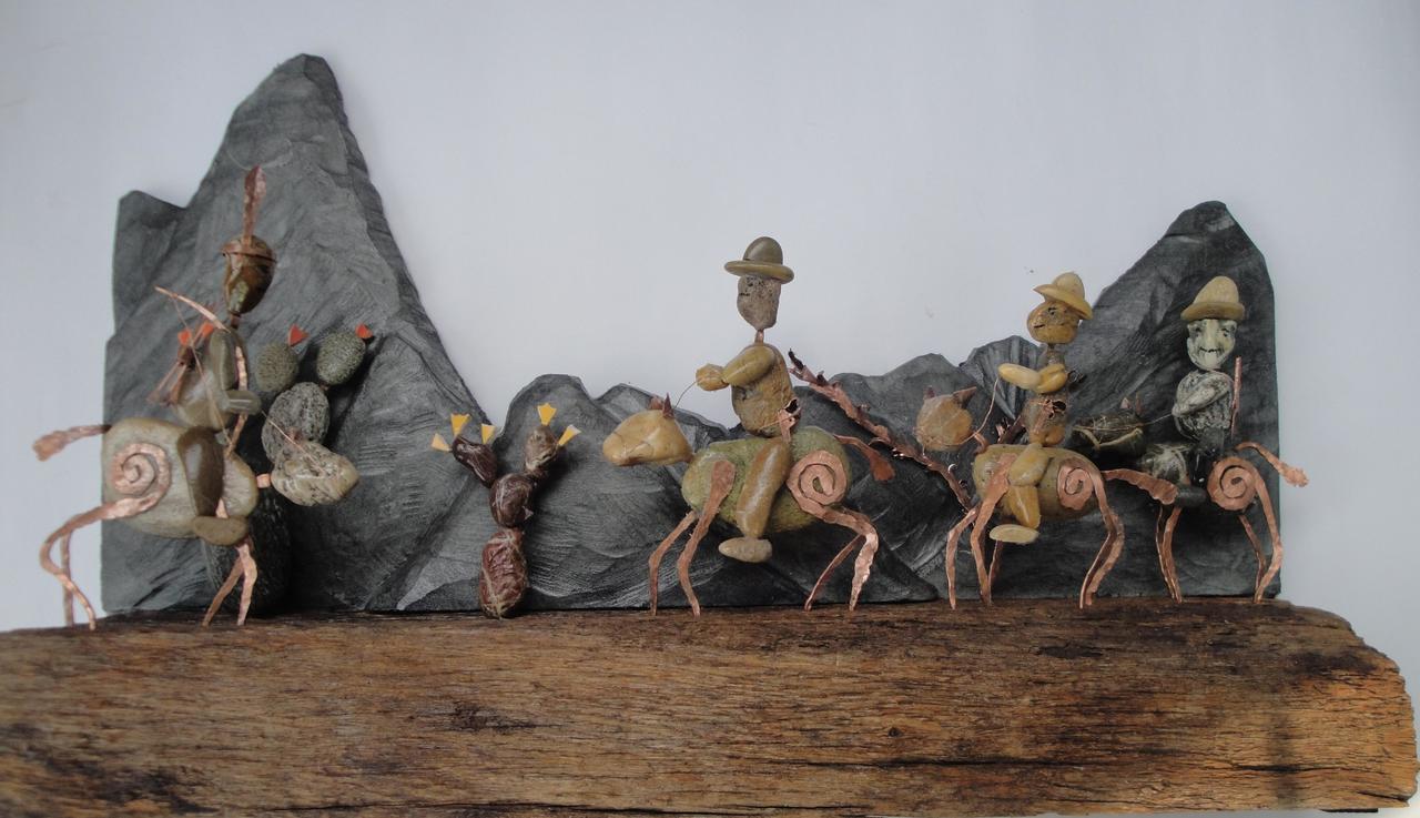 Ontmoeting is een tafereel van drie cowboys die een indiaan ontmoeten. Ze zijn allen te paard. Het is gemaakt van kiezel met uitgesmeed koper en gemonteerd op een stuk verweerde eiken biels. De achtergrond van bergen is gemaakt van hardsteen.