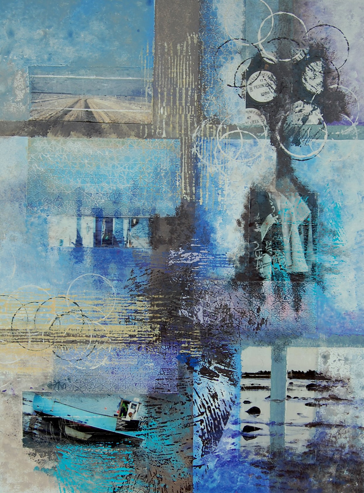 acryl op board met gemengde technieken , tape ,behang en drukken mixed media