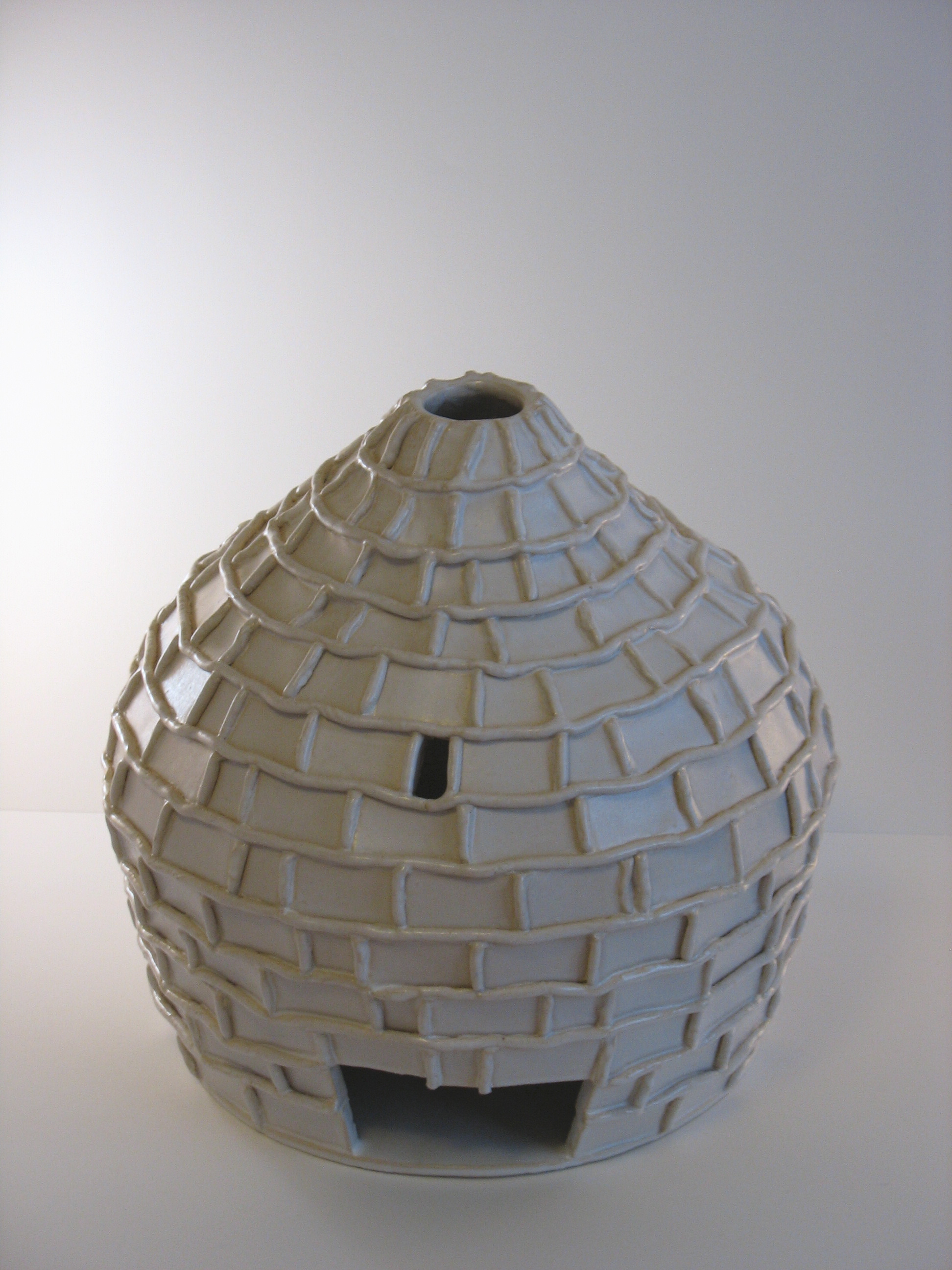 Iglo bijenkorf. opgebouwd uit stukjes klei met licht voegen. Thema bedreigde behuizing/volken
