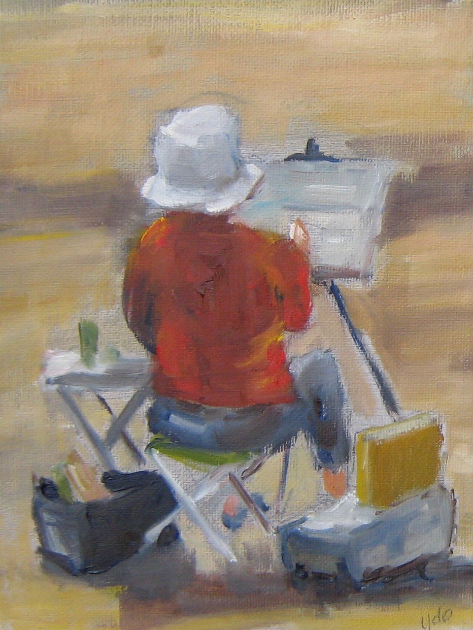 Een collega schilder tijdens het festival op het strand in Noordwijk.