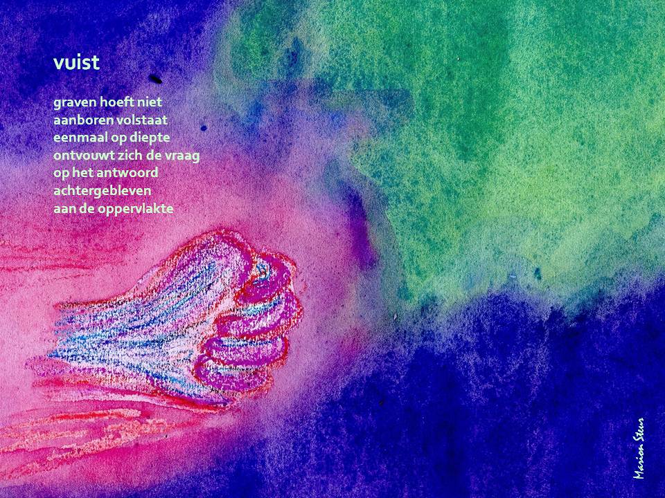 vuist graven hoeft niet aanboren volstaat eenmaal op diepte ontvouwt zich de vraag op het antwoord achtergebleven aan de oppervlakte gedicht op prent van gemengde technieken