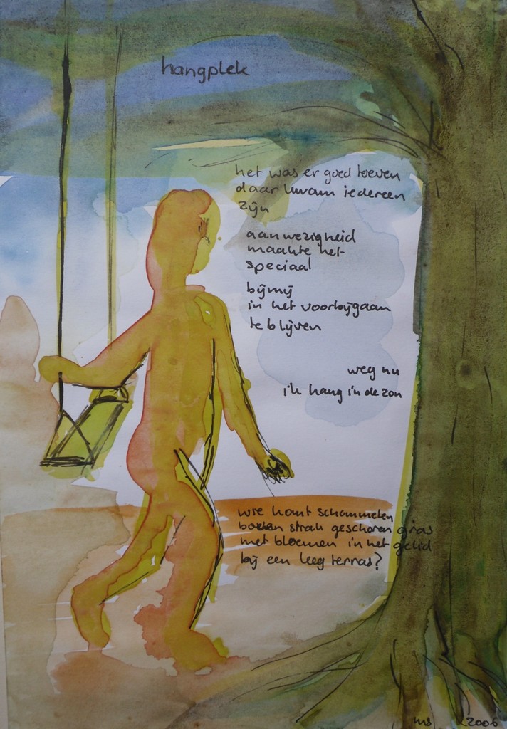 hangplek het was er goed toeven daar kwam iedereen zijn aanwezigheid maakte het speciaal bij mij in het voorbijgaan te blijven weg nu ik hang in de zon wie komt schommelen boven strak geschoren gras met bloemen in het gelid bij een leeg terras? Gedicht op aquarel/pentekening.