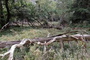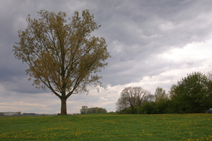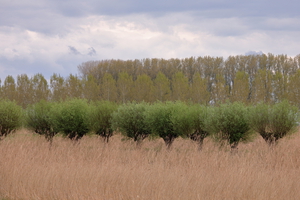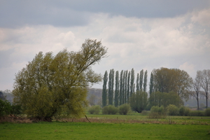 Wel zicht op de stad, maar over een grote watervlakte. Het water staat ook weer niet zo hoog want een haag van meidoorn komt nog boven het water uit.