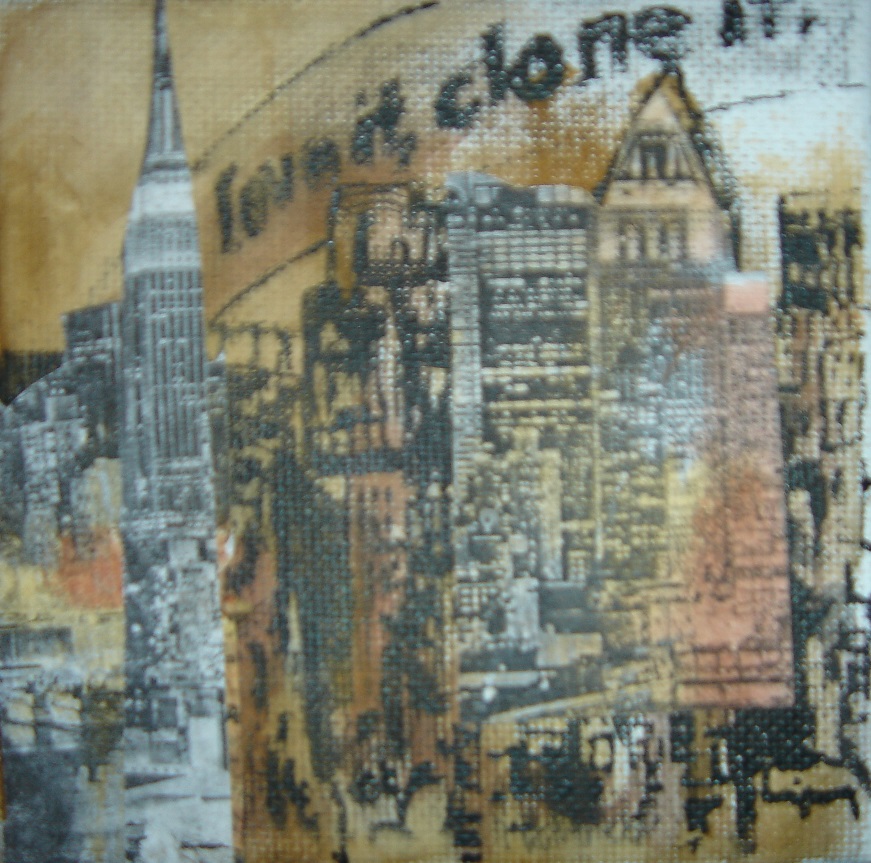 New York, "Love it, clone it". Getekend en geschilderd met rietpen en penseel in drie kleuren inkt op doekje 10x10 cm. Gemengde technieken. Eventueel te combineren met MARQUA009, 010 en 011. Nu van € 65 voor € 45.