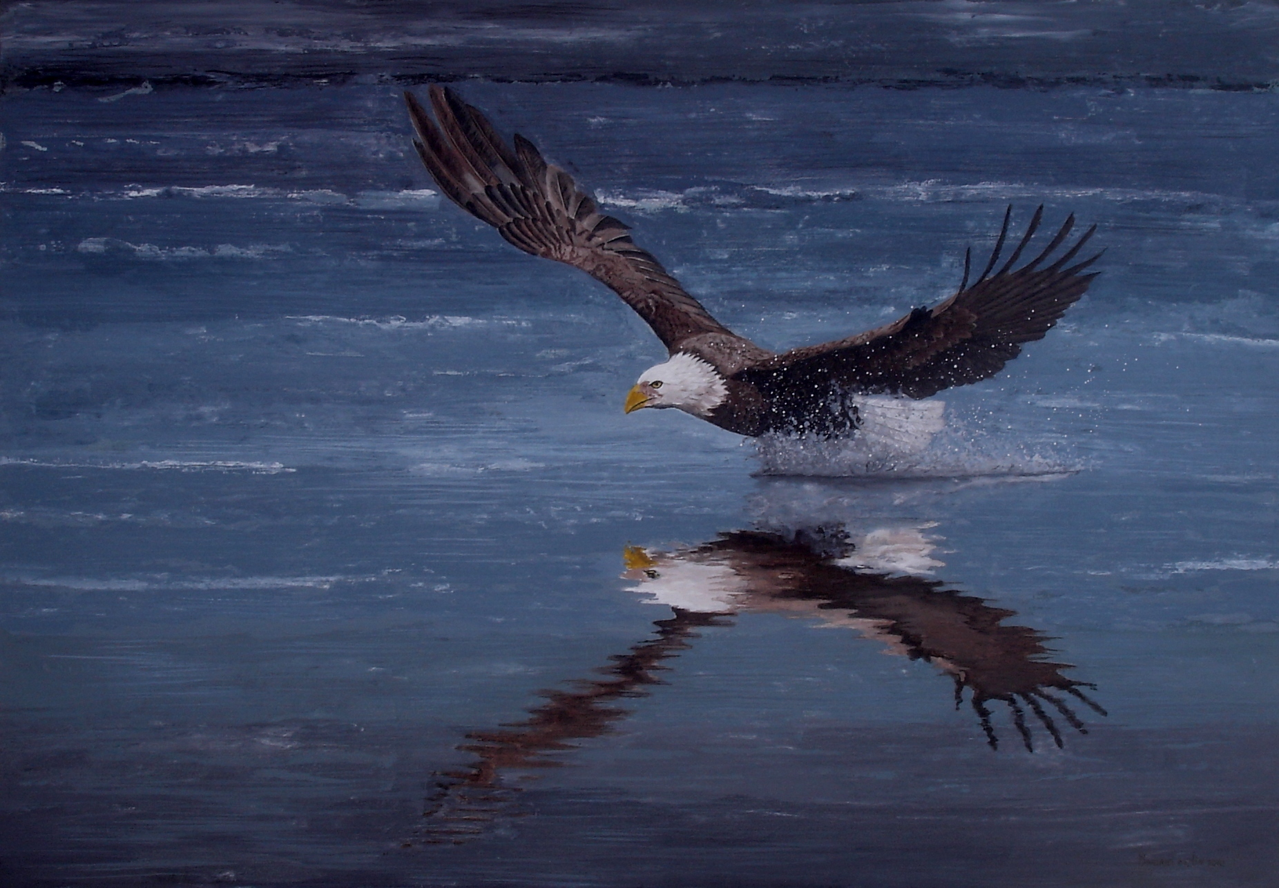 Zeearend met weerspiegeling, origineel handgeschilderd op linnen. 100 x 70 cm. Een reactie die ik kreeg op dit schilderij : Fantastic image ! I love how you even got the details such as the water spraying up as the talons hit it------just right. Stunning job !