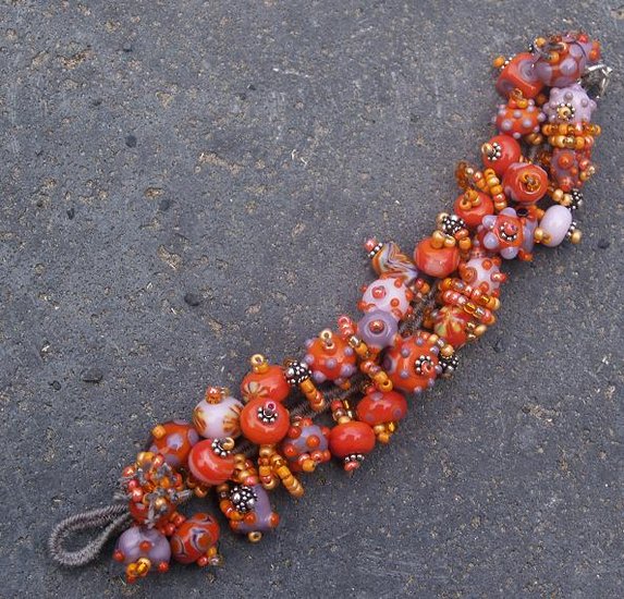 prachtige armband met oranje kralen met roze en paars gemaakt. gewaagde kleuren combi.