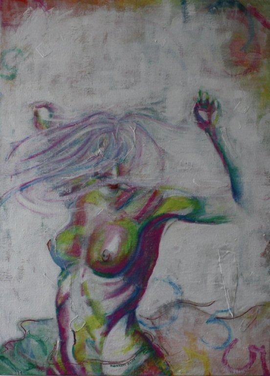 De vrouw is en blijft een belangrijke inspiratiebron voor mij om te schilderen. Dat doe ik vaak in thema’s (ongeveer 5 stuks) en natuurlijk de 'eenlingen'. De laatste tijd houd ik mij meer bezig om vrouwen en/of mannen in lijnenspel neer te zetten. Dat gecombineerd met een zorgvuldig uitgekozen achtergrond qua vlakverdeling en kleur,geeft mij het idee hoe ik de vrouw /man neerzet in het lijnenspel.Het moet een voorstelling worden waarbij alles een geheel vormt, maar ook apart mooi is om naar te kijken.