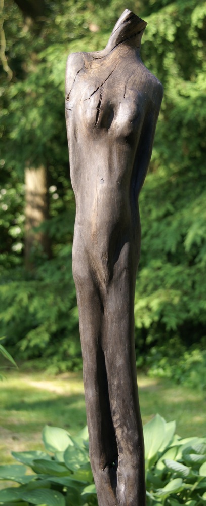 Een beeld is voor mij geslaagd als het spannend en mooi is. Als uitgangsmateriaal gebruik ik al gedeeltelijk verrot hout dat ik in het bos vind.