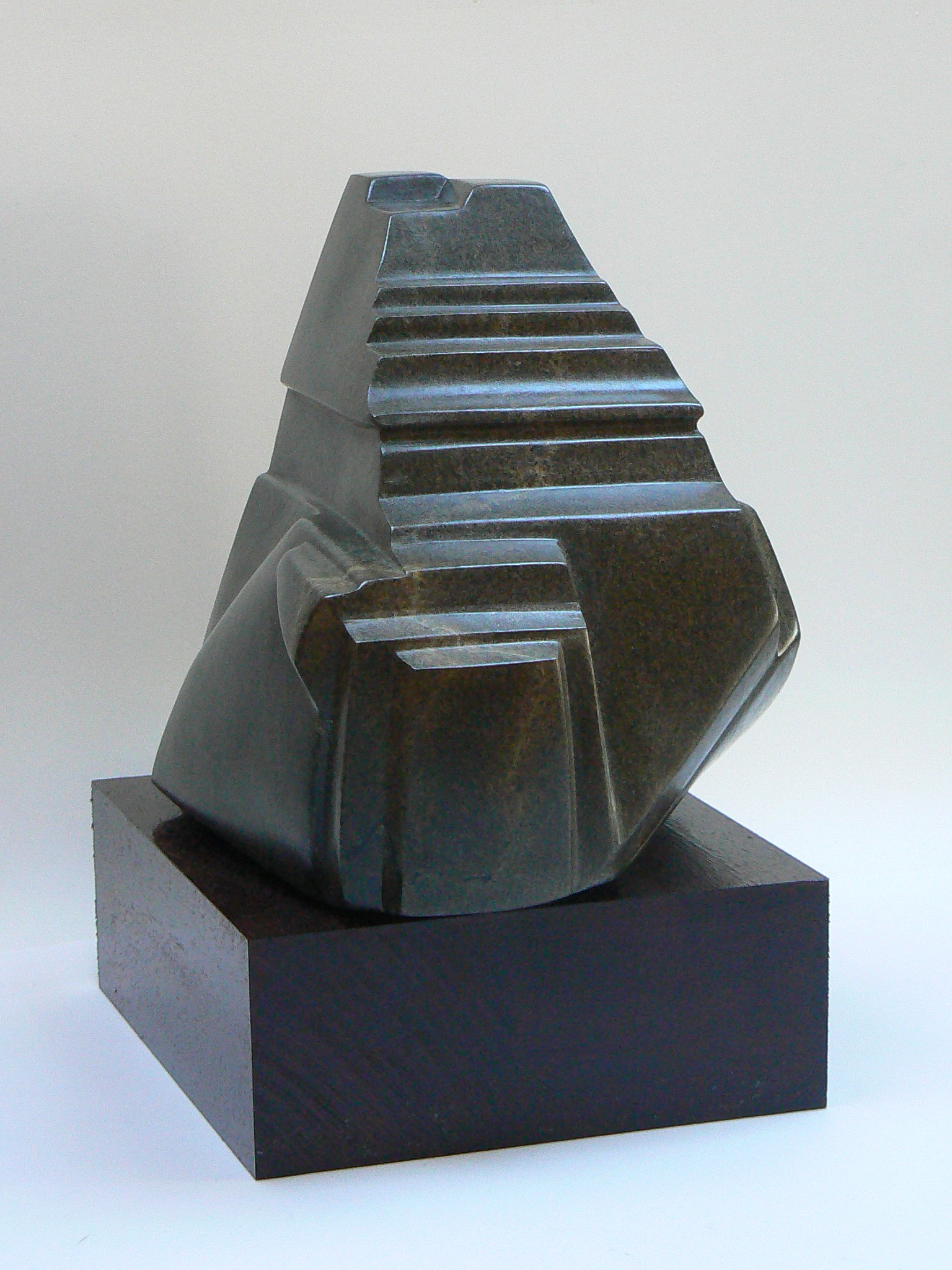 Een beeld van serpentijn op een mooie houten sokkel.