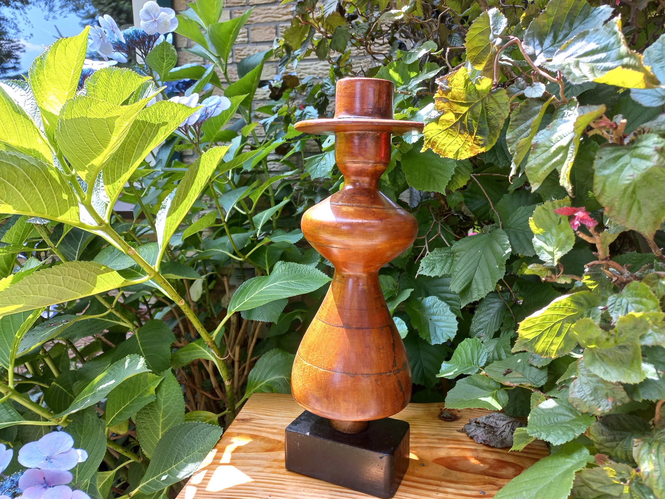The Spanish Lady kan zowel binnen als buiten geplaatst worden en is gemaakt van 9 stukken kersenhout van 15 bij 15 cm opelkaar gelijmd en gedraaid en daarna in de olie gezet en gevernist