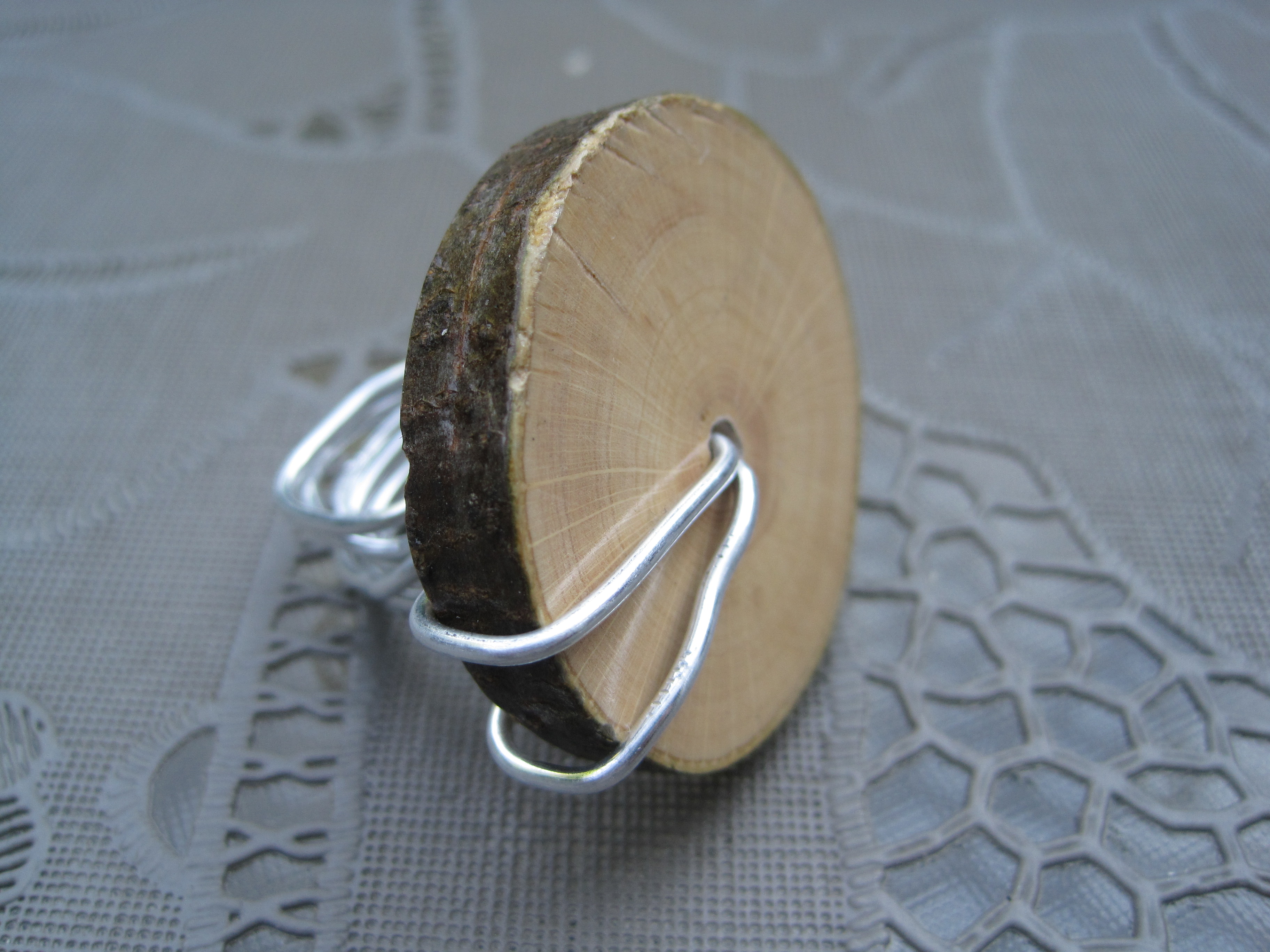 Een ring gemaakt van 2mm alluminiumdraad, met een schijfje van echte boomstam. In verschillende maten verkrijgbaar: mt. 14, 15, 16, 17, 18 en 19mm doorsnede. Ringen worden op bestelling gemaakt.