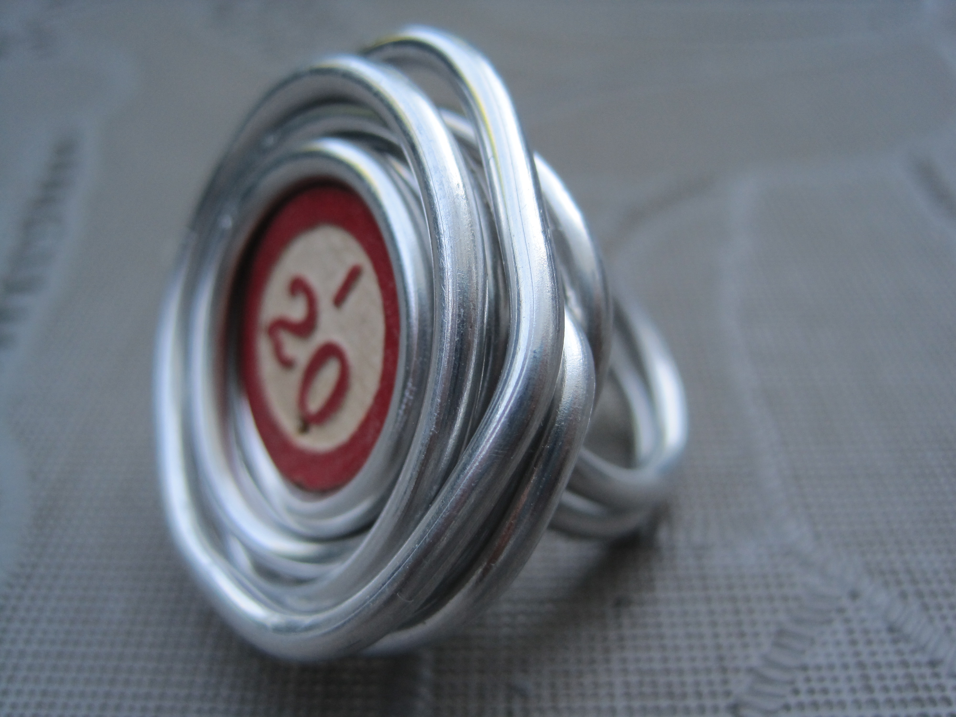 Een ring gemaakt van 3mm alluminiumdraad, met bingo steen. In verschillende maten verkrijgbaar: mt. 14, 15, 16, 17, 18 en 19mm doorsnede. Ringen worden op bestelling gemaakt.