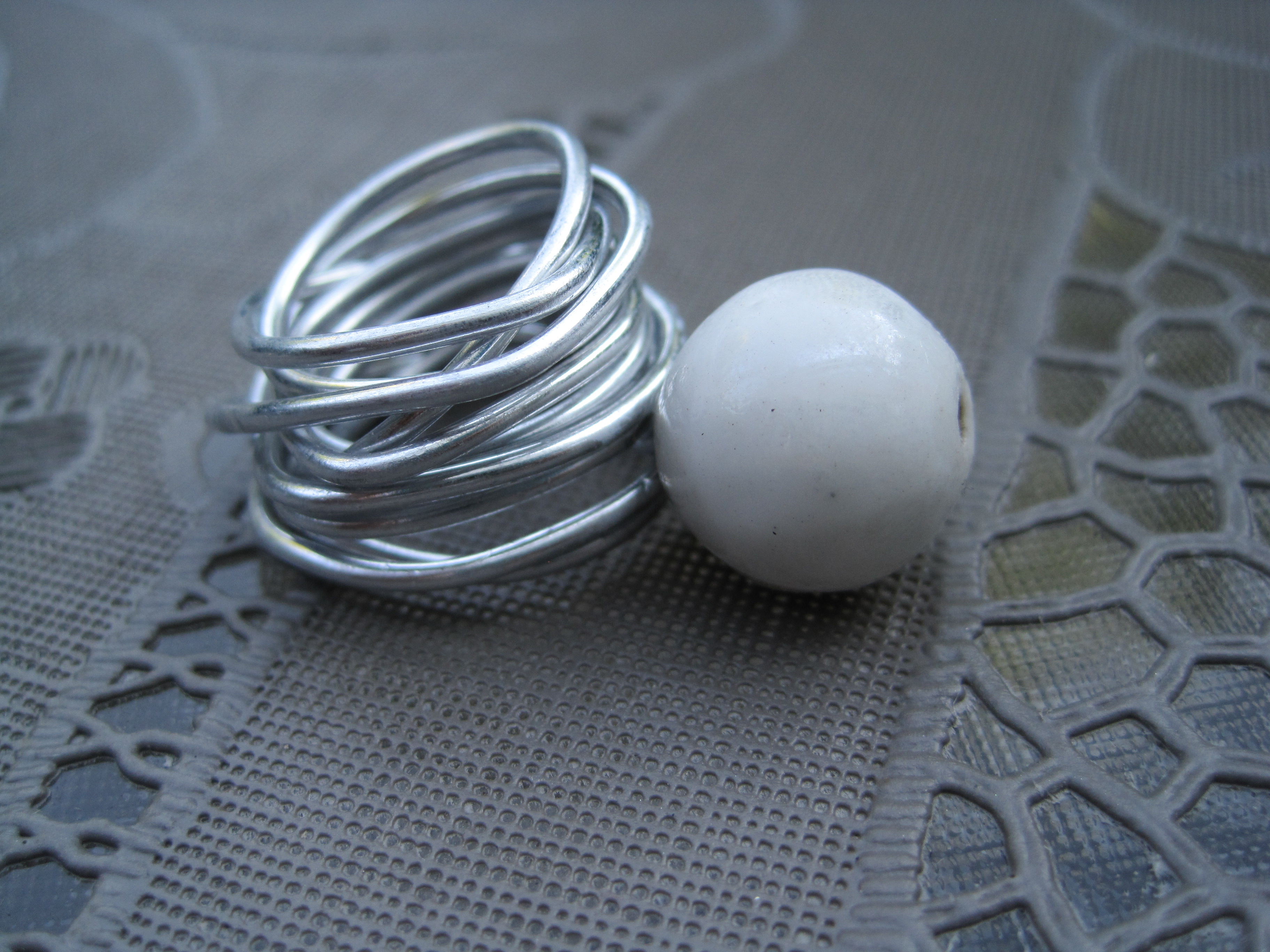 Een ring gemaakt van 2mm alluminiumdraad, met witte kraal. In verschillende maten verkrijgbaar: mt. 14, 15, 16, 17, 18 en 19mm doorsnede. Ringen worden op bestelling gemaakt.