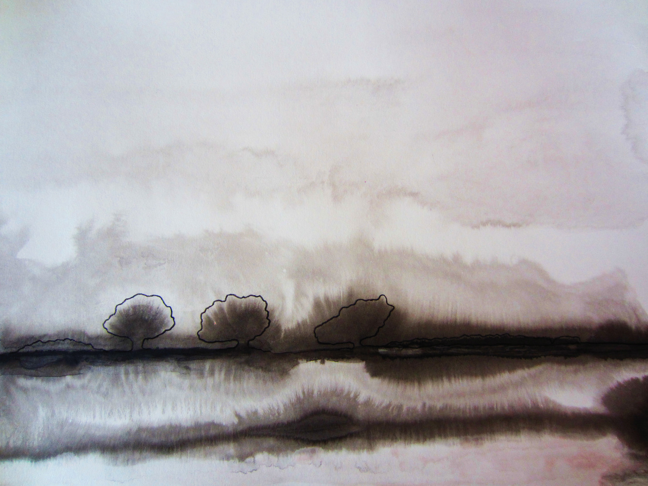 Landschap ontstaan door inkt in lijm te laten vloeien.
