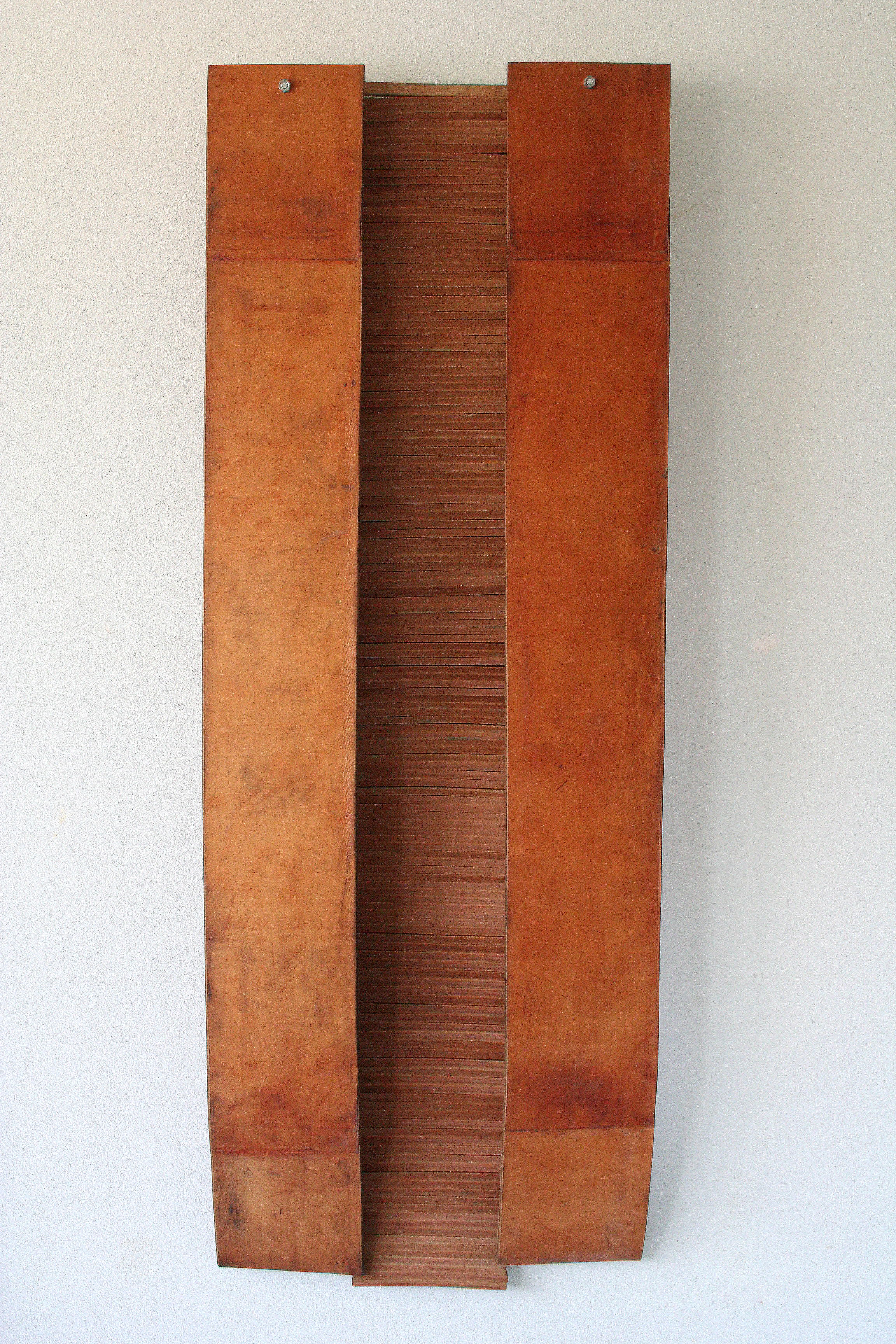 Drie-dimensionaal leren object dat aan de muur hangt. Het middelste stuk van het object bestaat uit kleine reepjes leer.