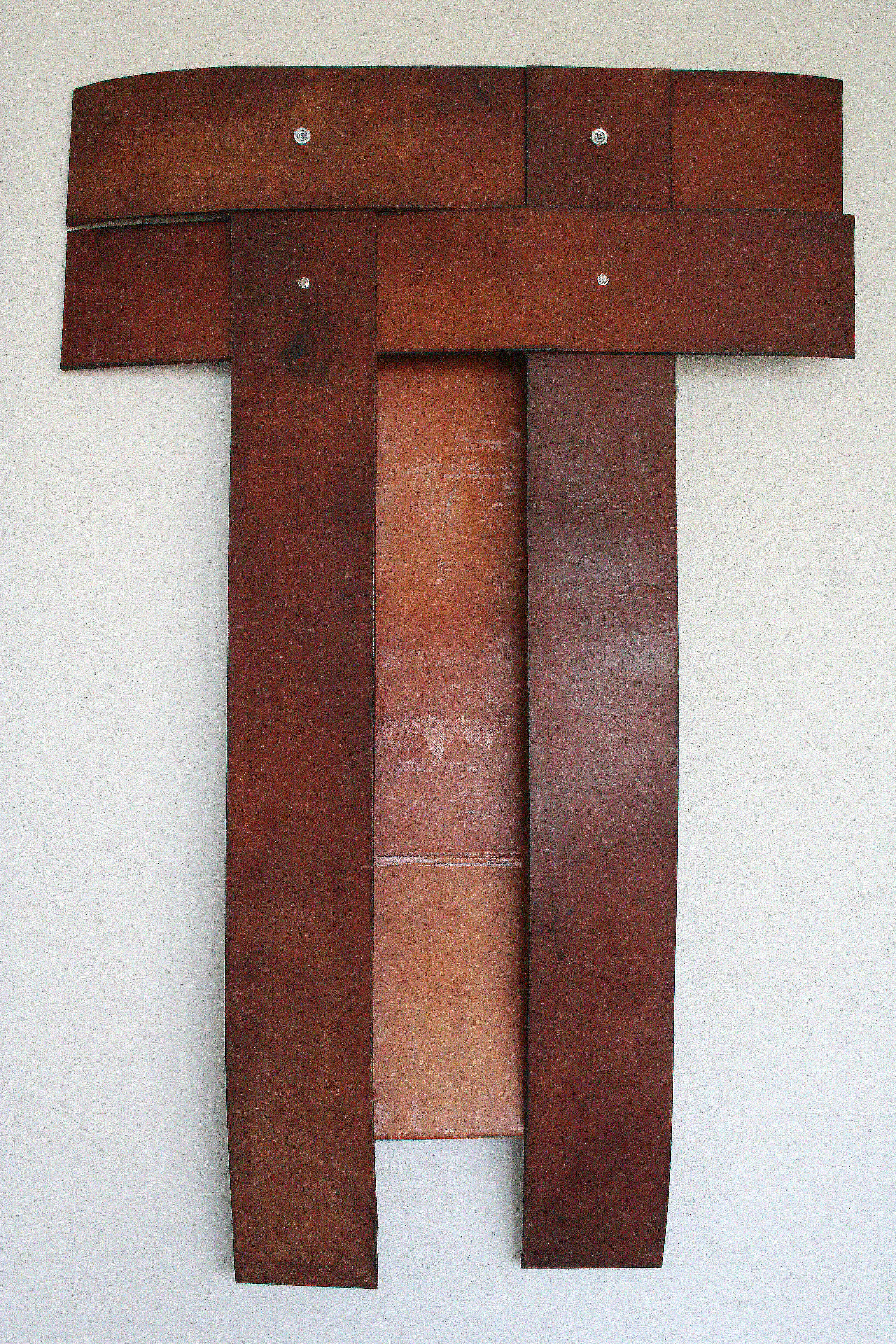 Drie-dimensionaal leren object dat aan de muur hangt.