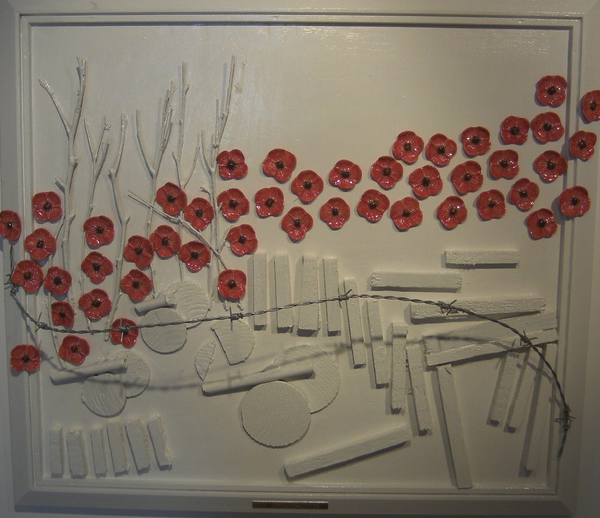 Dit werk is gemaakt in het kader van de herdenking van 100 jaar Wereldoorlog 1-De Grote oorlog.Het is mixed media en stelt een oorlogstafereel voor met kanonnen , loopgraven en prikkeldraad.De klaprozen of poppy's zijn het symbool van vrede...Het werk is gemaakt uit hout,keramiek en ijzer.