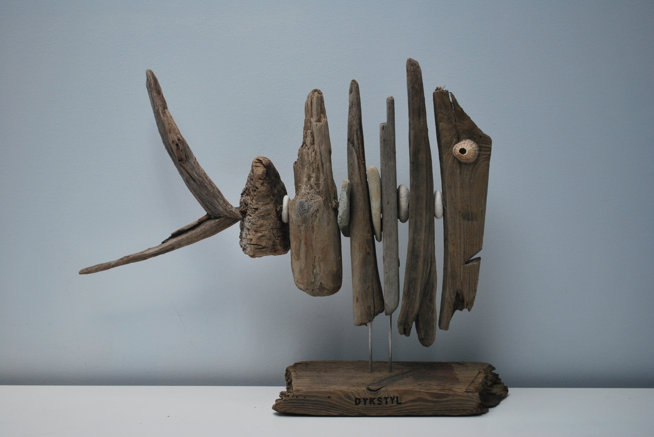 maakt al jaren houten beelden door natuurlijke objecten uit zee te koppelen. De beelden zijn ruw en puur.