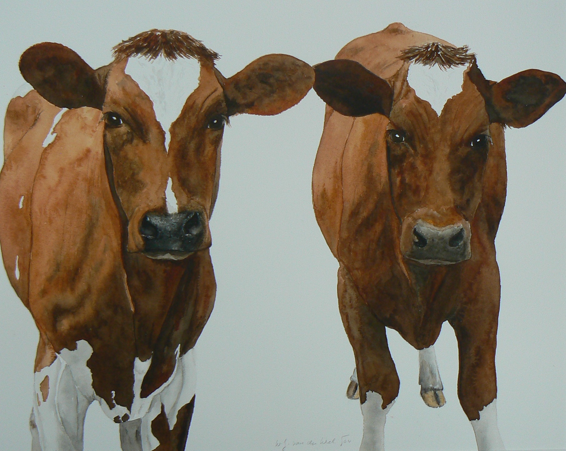 Twee heel nieuwsgierige roodbonte vaarzen. Niet zoveel glans op de vacht, wel twee mooie koppies.