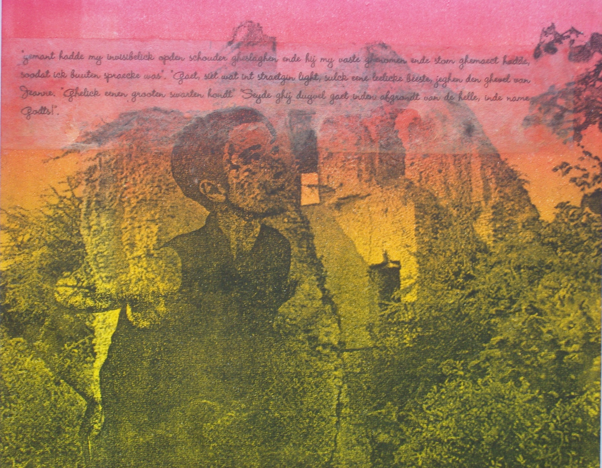 Jeanne Panne II Fotopolymeer ets Jeanne is klaar voor de ontmoeting met "Tweeblancken" de duivel waar ze veel mee samenkwam (volgens getuigenissen) Dit is het 2de werk uit een reeks van 3 De andere 2 werken geven een beeld uit een ander tijdstip in het levensverhaal van Jeanne Panne, de heks van Nieuwpoort