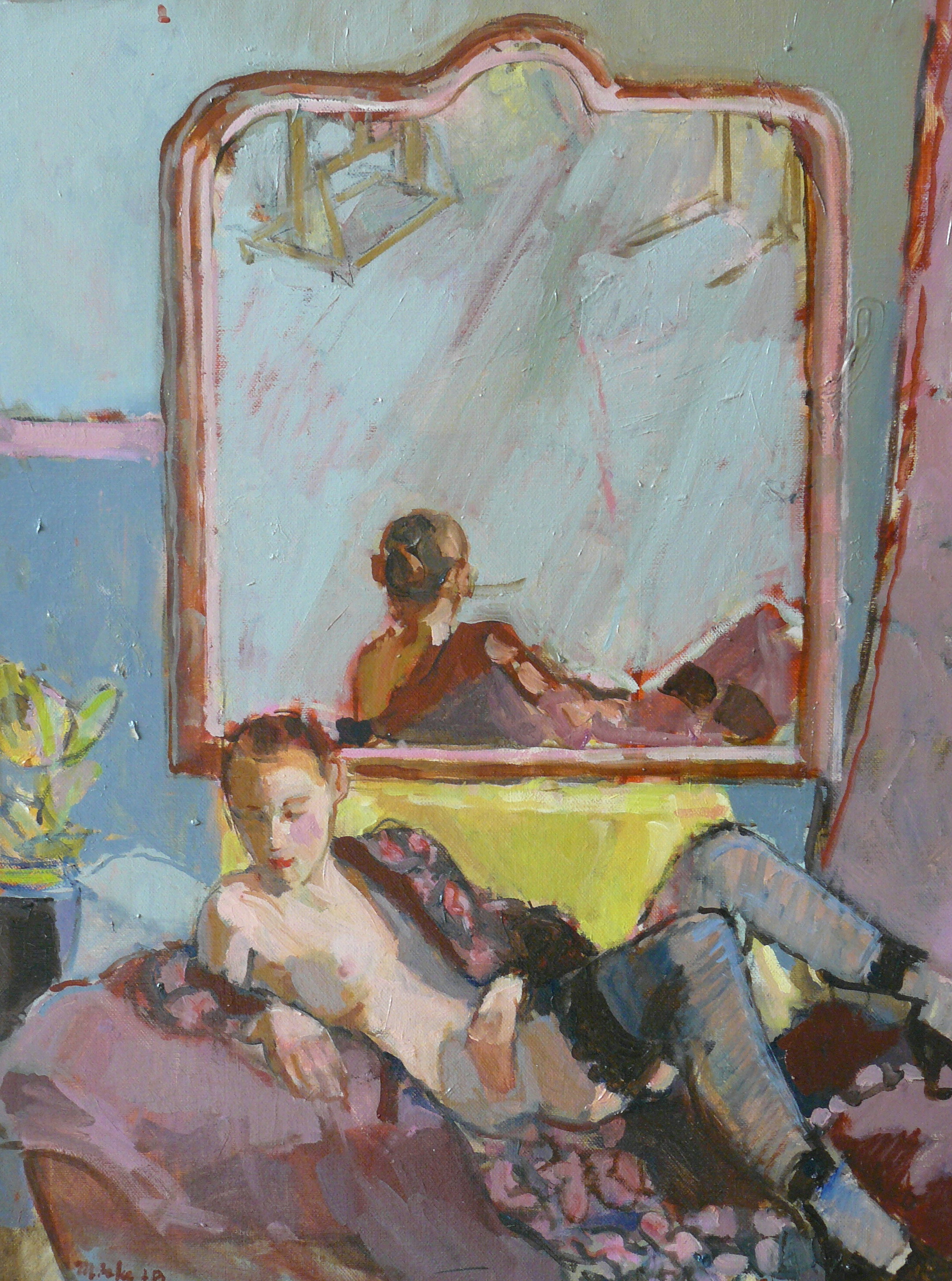vrouw liggend voor spiegel