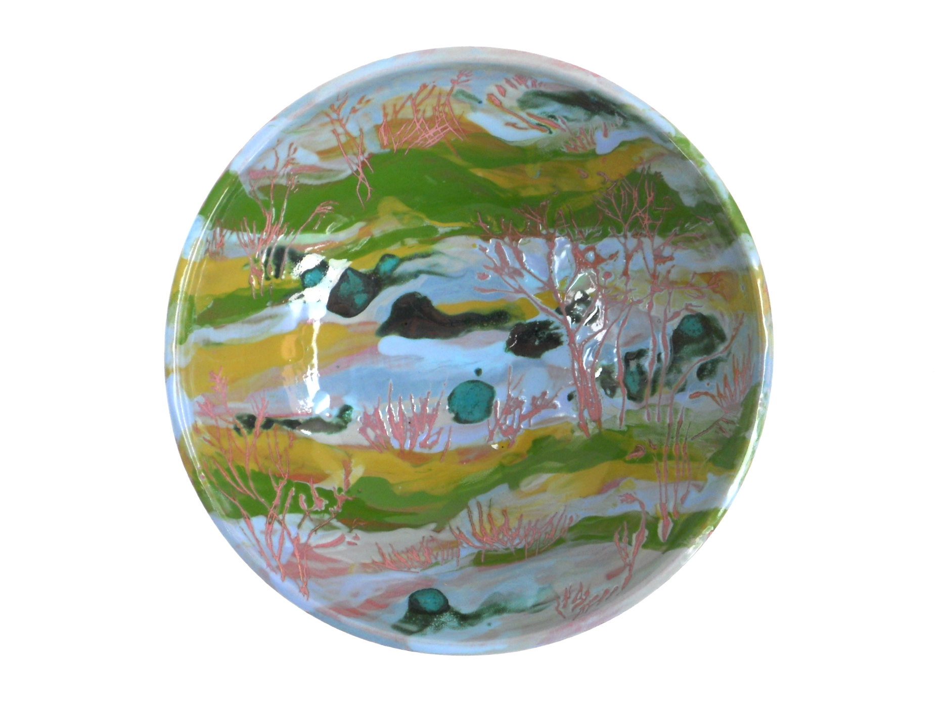 De ronde vorm van mijn keramiekschalen - die ik zelf draai - schept een ideale ruimte om bloemen, bomen en landschappen te verbeelden en in te sluiten. Zo kan ik tekenen, schilderen en ruimtelijk vormen met elkaar combineren.
