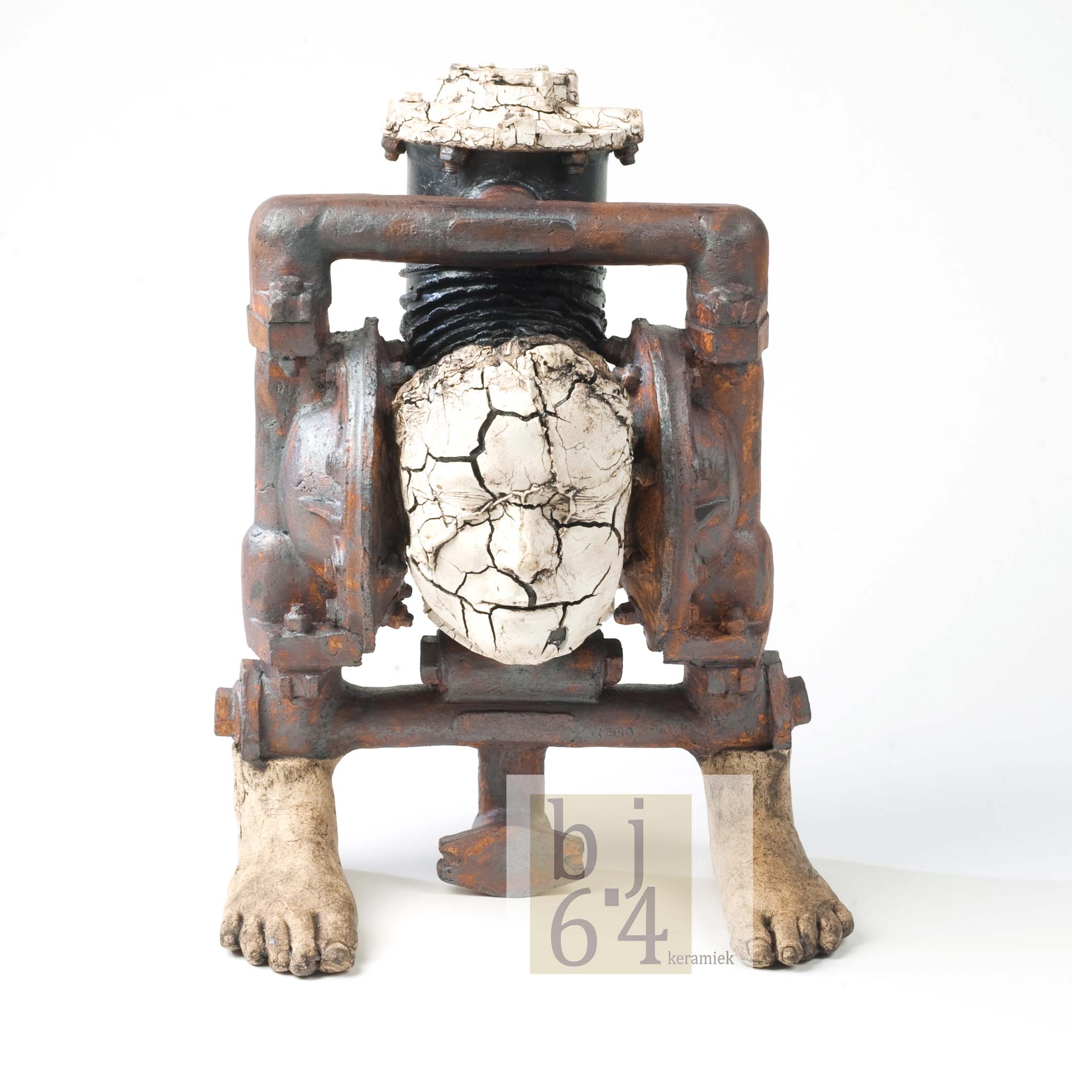 Op voeten geplaatste vloeistof pomp. Gezicht in porselein met de bekende cracks. Uit het hoofd een kachelpijp met machineonderdeel on top. Bouten, klinknagels en moeren. All made van klei.