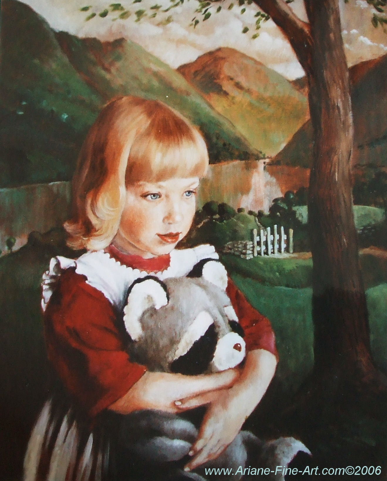Een portretje van een meisje en haar knuffelbeer.